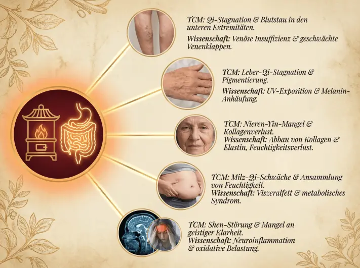 Und die westliche Medizin? Sie werden Ihnen verkaufen: - Kompressionsstrümpfe für Ihre Venen (behebt nicht die Durchblutung) - Retinol für Ihre Haut (behebt nicht die Quelle) - Abführmittel für Ihren Darm (macht es schlimmer) - Diätpillen für Ihren Bauch (zerstört Ihren Ofen schneller)
