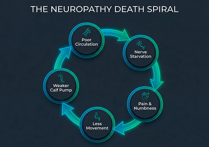 When you have neuropathy, you move less. When you move less, your calf muscles weaken. When your calf muscles weaken, blood pools in your feet instead of circulating.