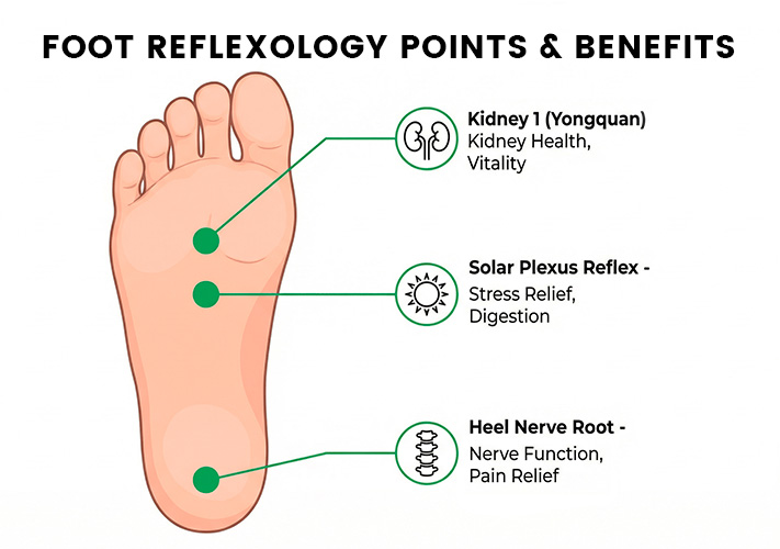 Precision electrodes target the Kidney 1 (Yongquan) point for energy restoration, the Solar Plexus Reflex for nervous system calming, and the Heel Nerve Root for plantar fasciitis relief.