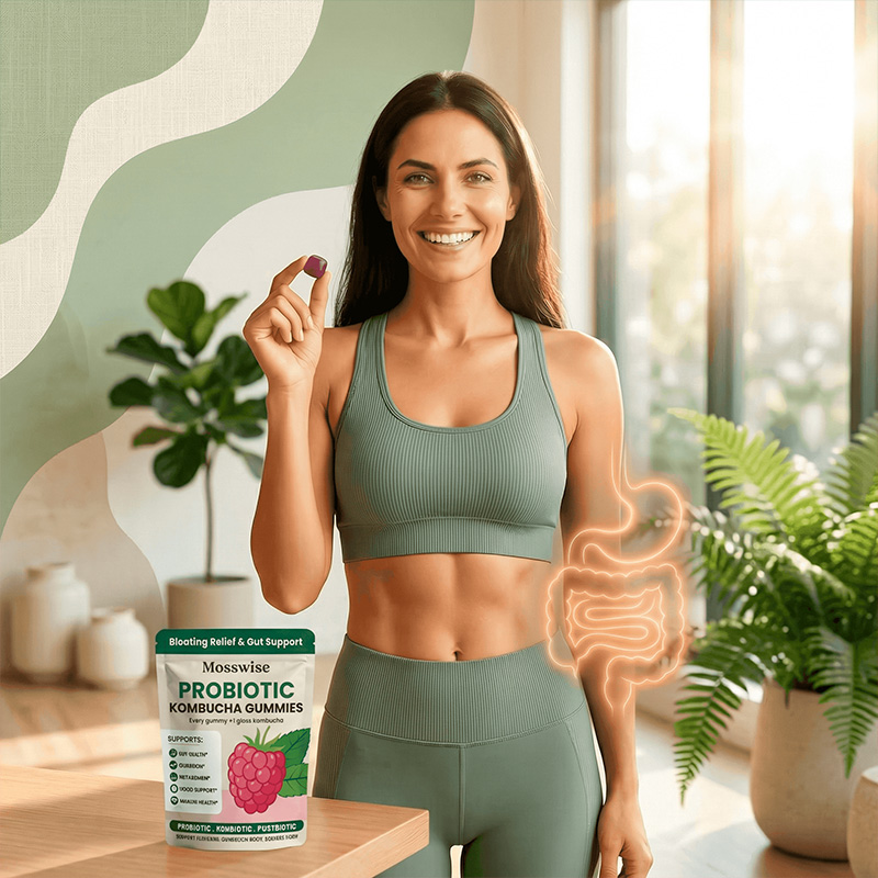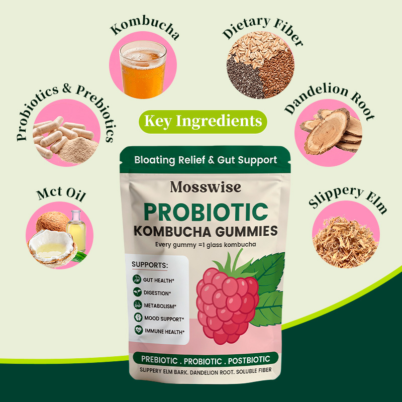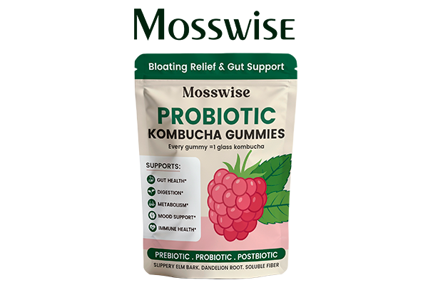 Introducing Mosswise, a unique blend of all-natural ingredients. Rapidly delivers live probiotics, prebiotics, and postbiotics through delicious kombucha gummies, rebuilding gut balance and soothing digestion. Keeps you safe from bloating and supports overall gut health!